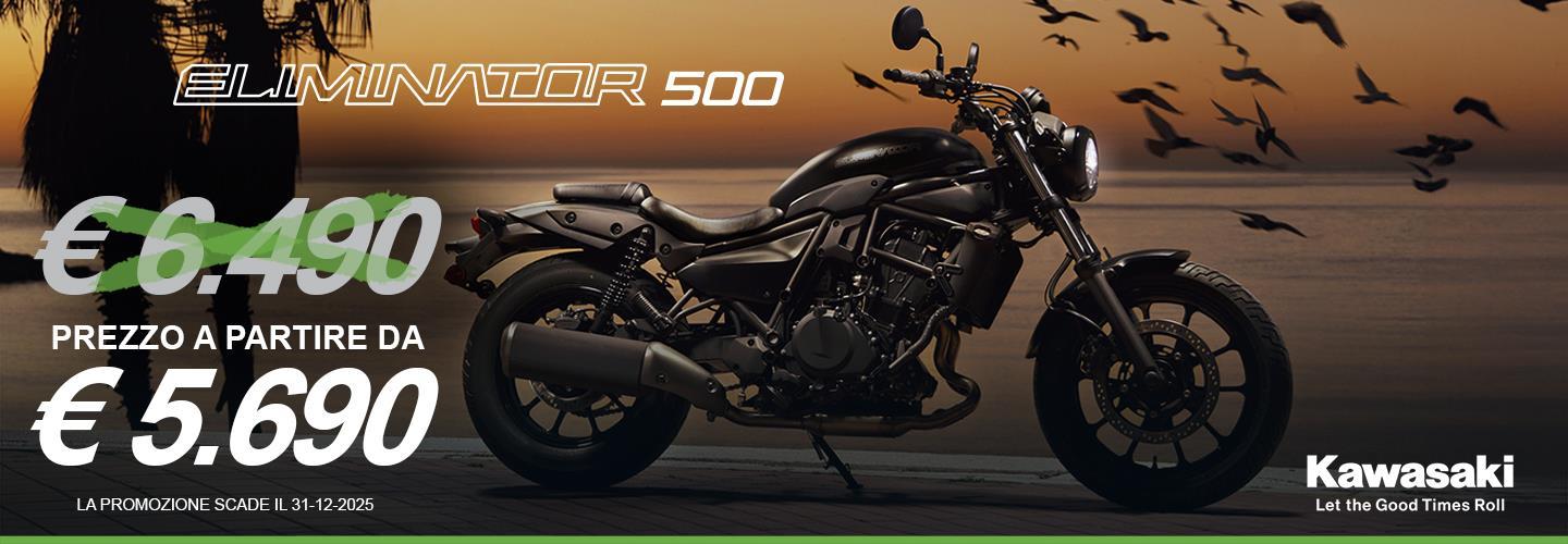 Eliminator 500: stile essenziale, comfort assoluto. Con sella bassa, grande maneggevolezza e design senza tempo unito a tecnologia moderna, è la cruiser più accessibile di Kawasaki. JUST RIDE.