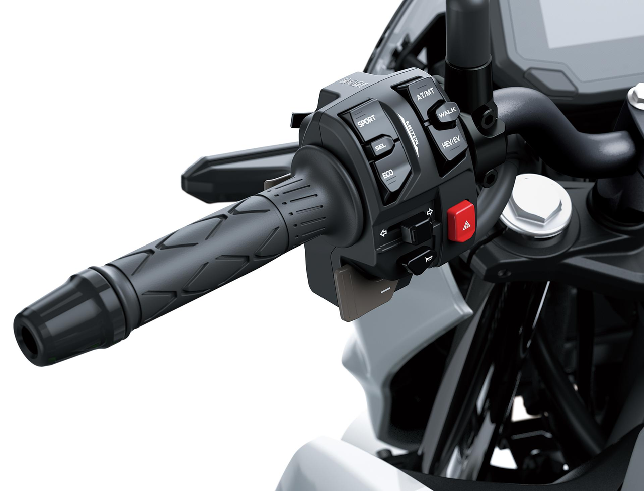 Button-Shift è una delle nuove esperienze di guida offerte dai modelli HEV di Kawasaki. Invece di utilizzare il pedale del cambio per inserire le marce, il pilota avvia il cambio marce tramite i pulsanti sul manubrio sinistro. Un interruttore azionato con le dita, posizionato più lontano, serve per cambiare marcia verso l’alto; un interruttore azionato con il pollice serve per cambiare marcia verso il basso. L’azionamento delle marce e della frizione idraulica è poi gestito dalla Trasmissione Manuale Automatizzata della moto, che rende possibile questa funzione.