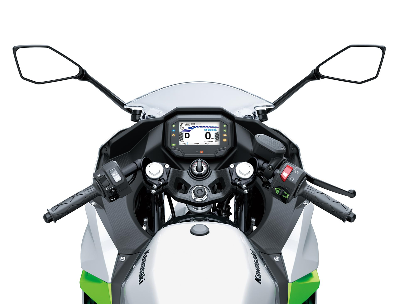 Esclusiva dei modelli EV e HEV Kawasaki, la funzione e-boost consente ai piloti di accedere temporaneamente a una potenza extra per un’accelerazione più decisa e una velocità massima più elevata. Per evitare il surriscaldamento della batteria, il funzionamento dell’e-boost è limitato nel tempo (la durata varia a seconda del modello). Quando tutte le condizioni sono soddisfatte, la disponibilità dell’e-boost viene indicata sullo schermo tramite un indicatore o tramite il misuratore e-boost. Premendo il pulsante sul lato destro del manubrio, la funzione si attiva, aumentando potenza e coppia. Il misuratore e-boost (che diventa ora viola) mostra il tempo residuo disponibile. Una volta che la moto è pronta nuovamente, la funzione e-boost può essere riattivata. L’e-boost può essere attivato sia in movimento sia da fermo.