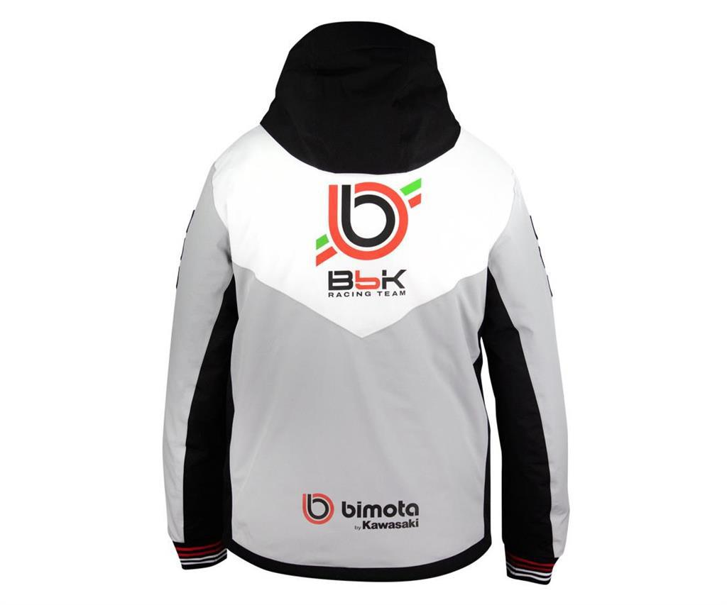 Giacca imbottita impermeabile con logo Bimota/BbKRT in grigio, bianco e nero. È dotata di cappuccio con visiera integrata, cerniere impermeabili e cordini regolabili con fermacorda. Le cuciture sono nastrate per aumentare la resistenza all'acqua/vento. Una giacca progettata per tenerti al caldo sia nel paddock che nel tempo libero.