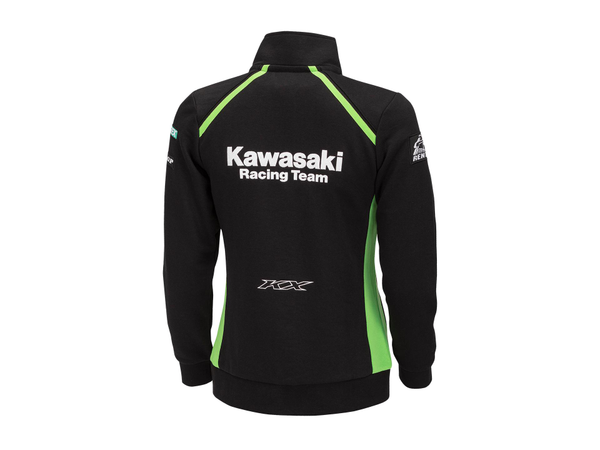Felpa Kawasaki MXGP 2024 nera e verde full zip con tasche esterne, collo alto e polsini a coste. Tasche laterali con zip Orlo e polsini a coste Loghi KRT e KX cuciti Loghi degli sponsor Tessuto French Terry non spazzolato 80% cotone 20% poliestere