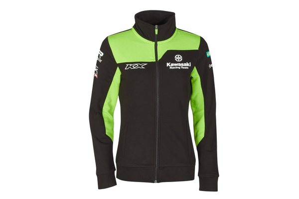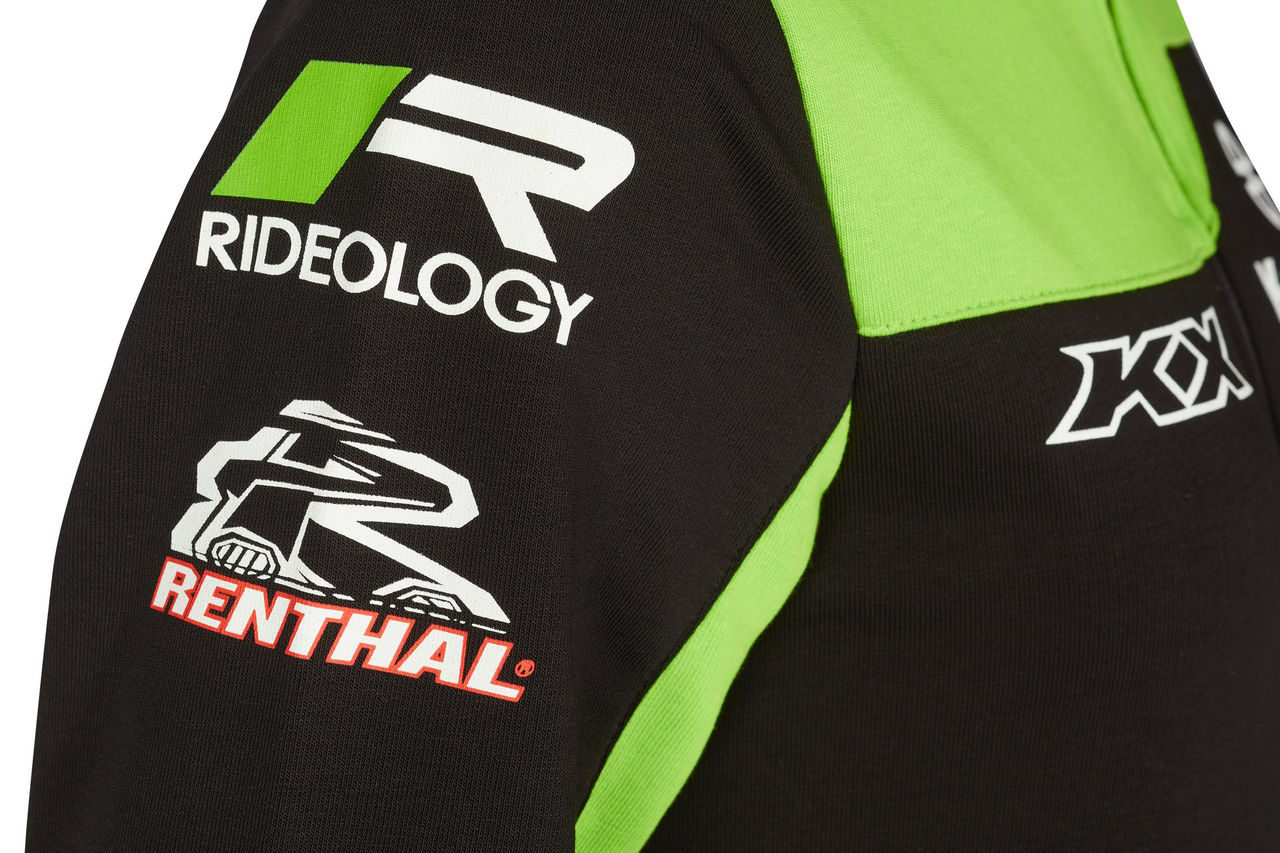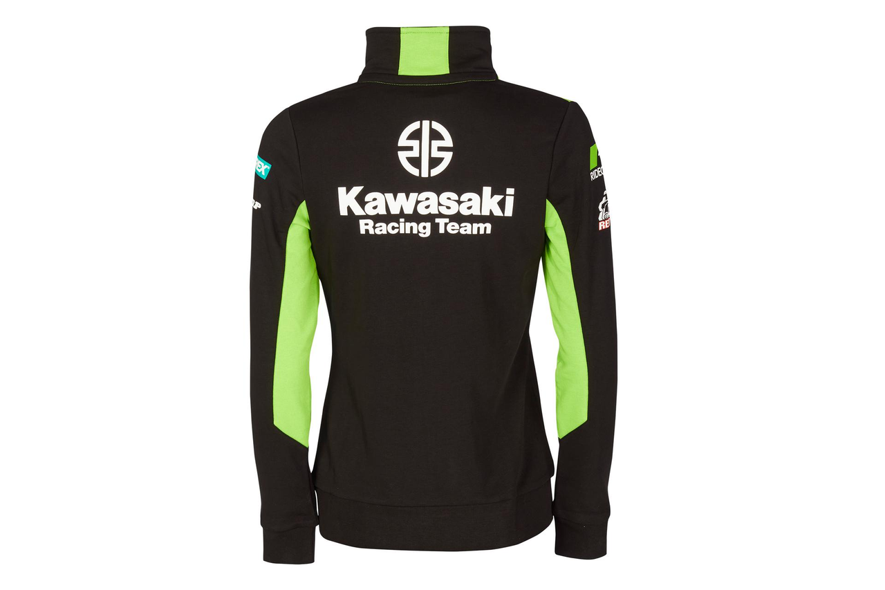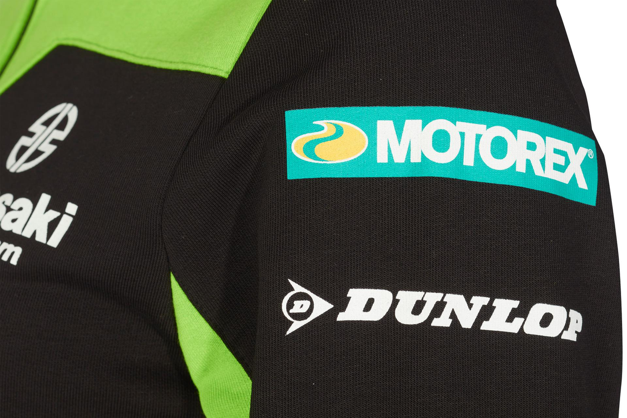 Felpa Kawasaki MXGP nera e verde full zip con tasche esterne, collo alto e polsini a coste. Tasche con zip. Polsini a coste. Logo Kawasaki Racing Team e loghi degli sponsor. Tessuto French Terry non spazzolato. 80% cotone 20% poliestere.