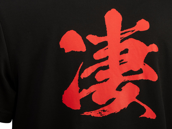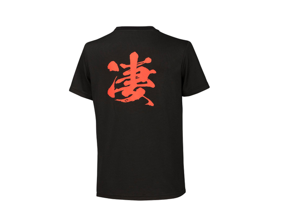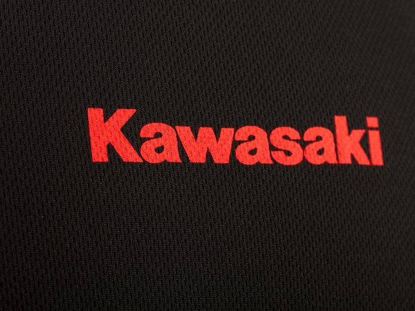 T-shirt girocollo nera a maniche corte con loghi Kawasaki e Sugomi stampati in rosso. Logo e grafica stampati. Tessuto a maglia double face. 50% cotone, 50% poliestere.