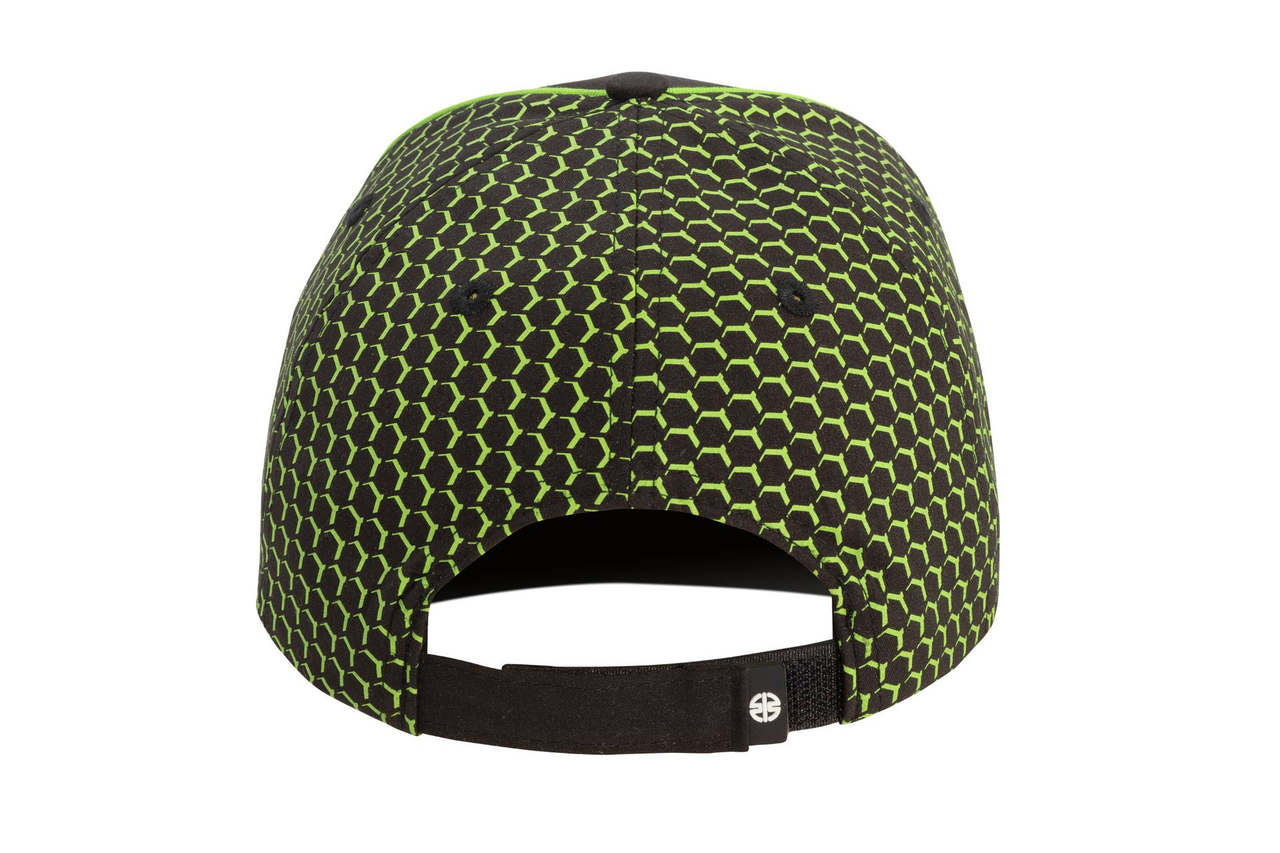Cappellino con visiera a sei pannelli con fori per l'aria ricamati Circonferenza regolabile con velcro Stampa esagonale verde Microfibra 100% poliestere