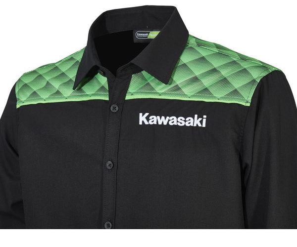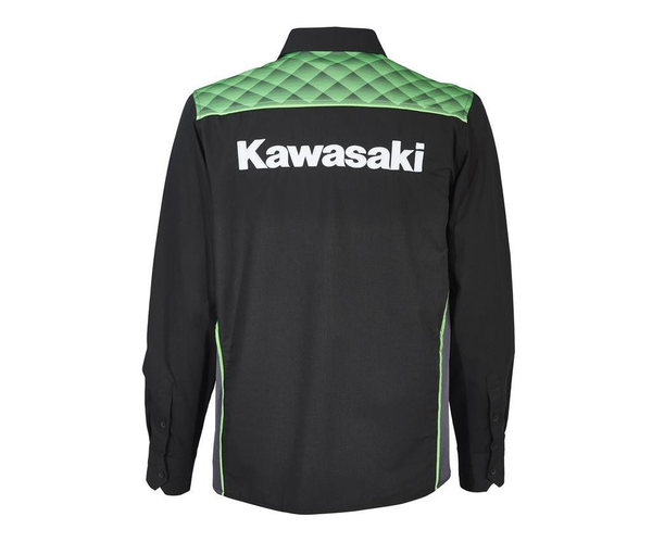 Distinguiti con eleganza all'interno del paddock! Indossa anche tu la nuova camicia Sports Kawasaki a maniche lunghe con loghi corporate ricamati ed un motivo lime green stampato all'altezza delle spalle.