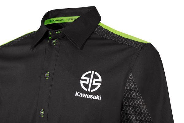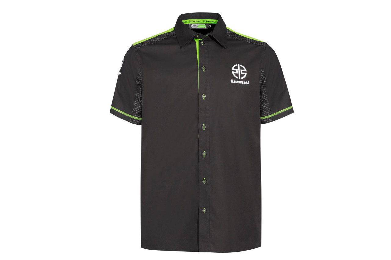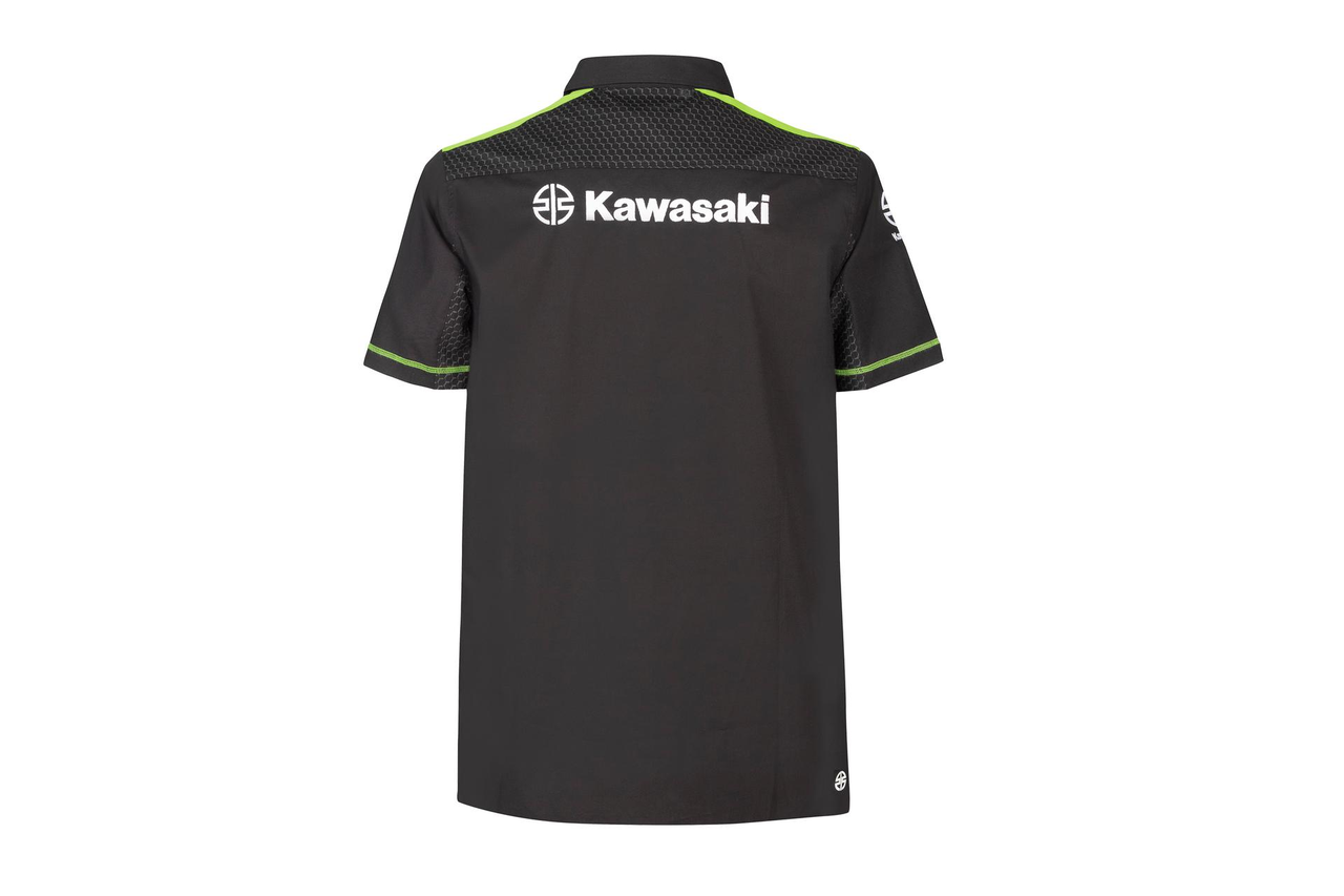 Camicia Kawasaki a maniche corte con bottoni Stampa esagonale grigia sulle spalle Apertura frontale con bottoni verdi a contrasto Tessuto popeline di peso medio 97% cotone 3% elastan