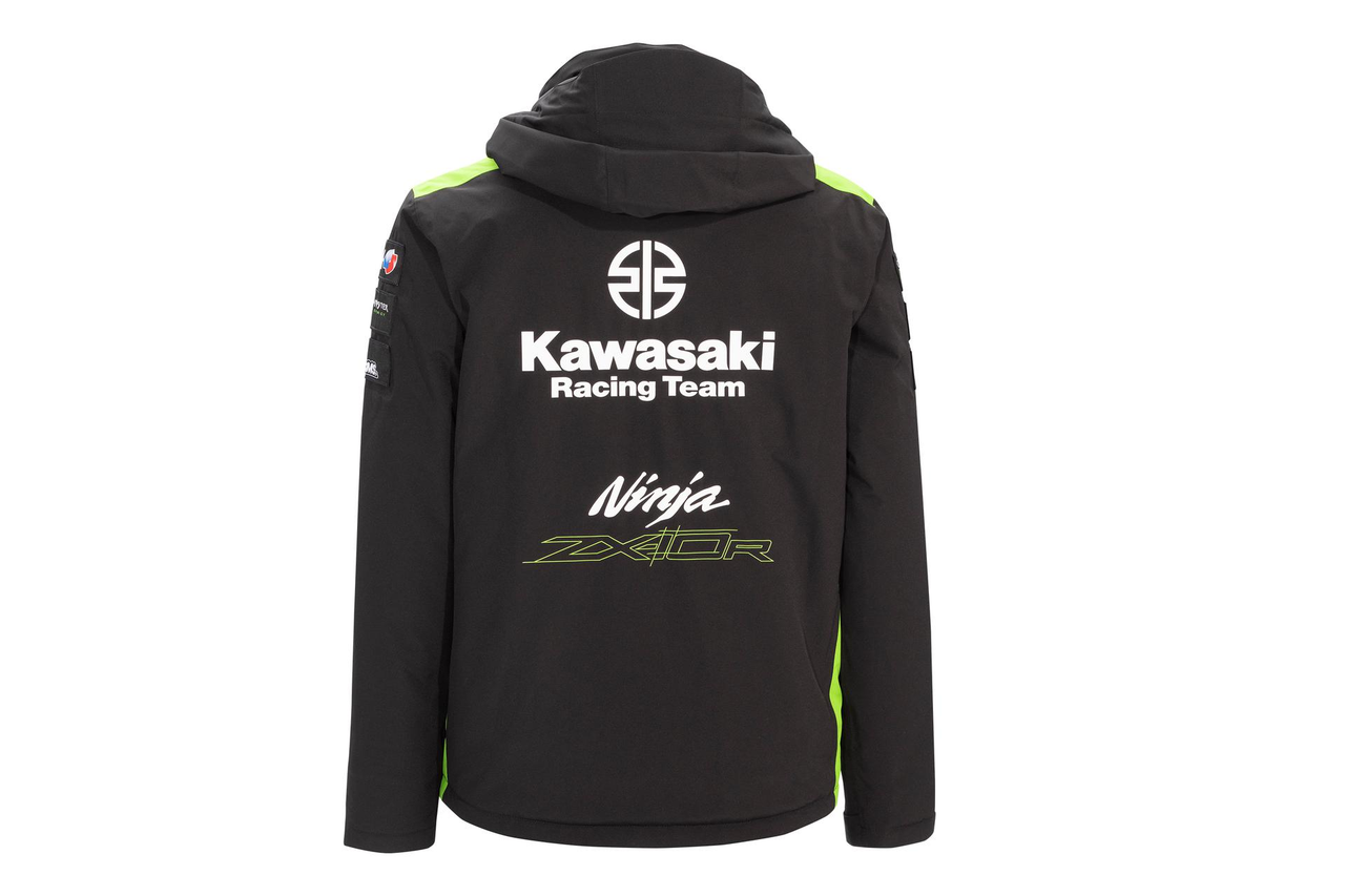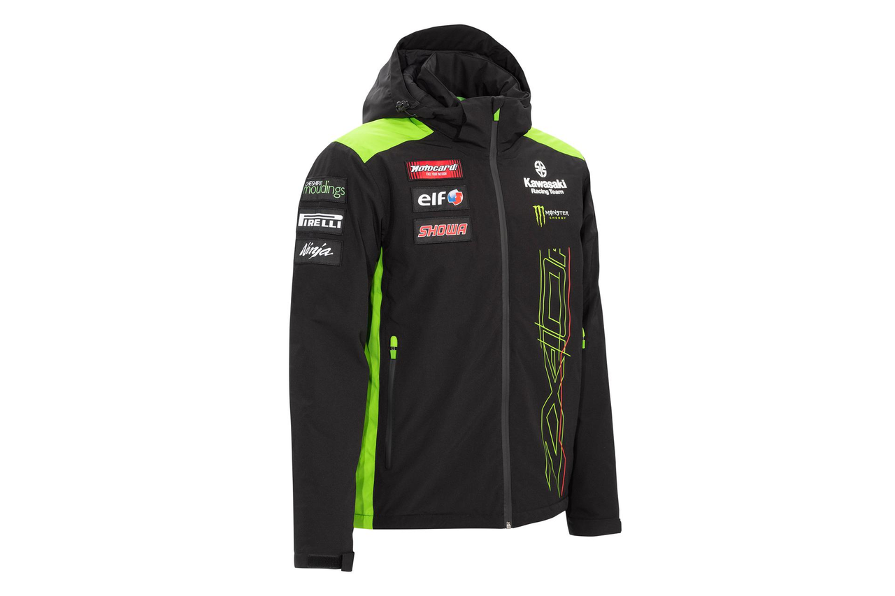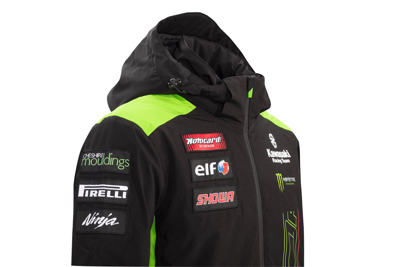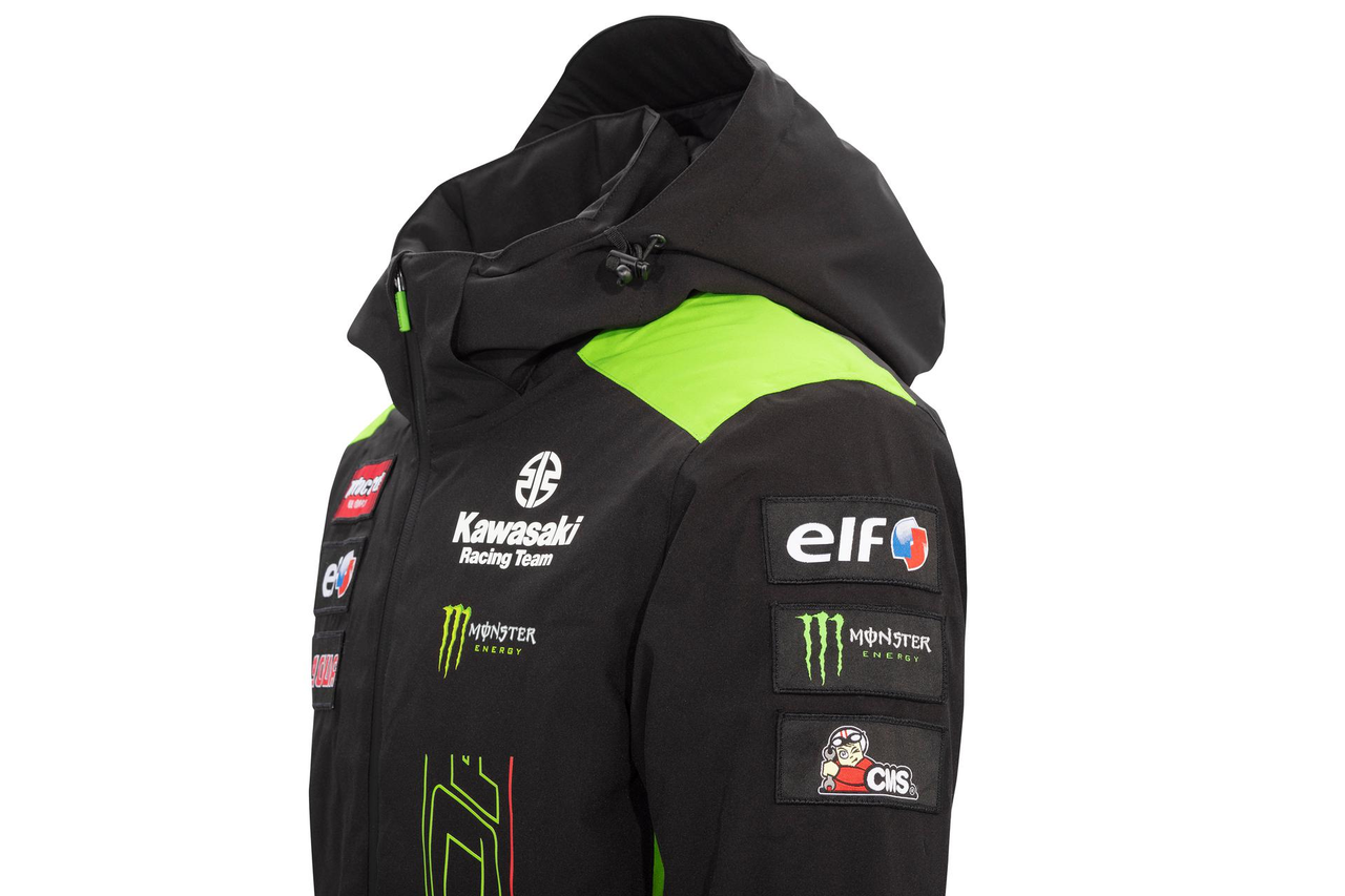 Giacca imbottita impermeabile nella colorazione ufficiale del team Kawasaki WSBK 2023 con cappuccio rimovibile, tasche interne ed esterne con zip e polsini interni. Cucitura nastrata. Fodera termica trapuntata. Polsini interni elasticizzati. Tasche interne ed esterne con zip. Logo Kawasaki e loghi degli sponsor. Cappuccio rimovibile. 96% Poliestere 4% Elastan