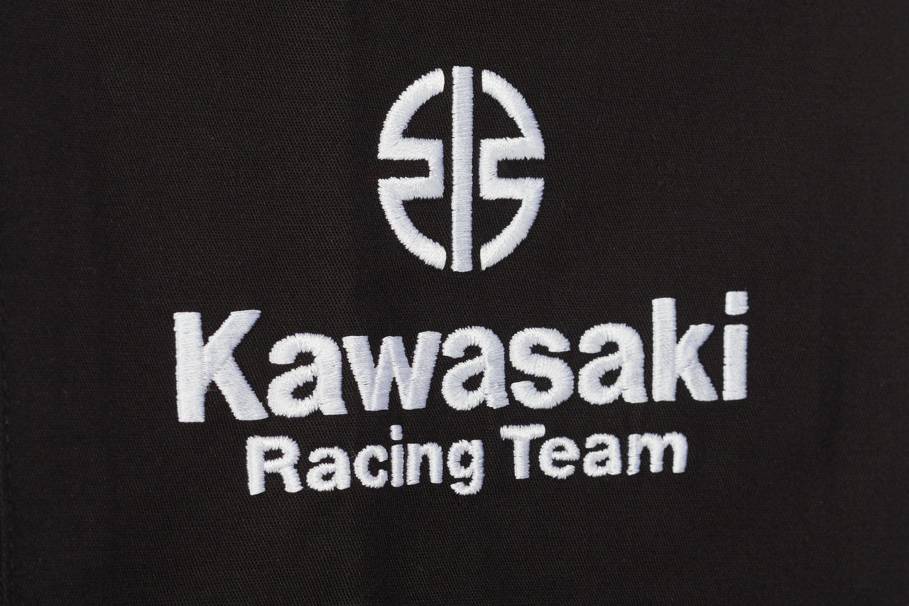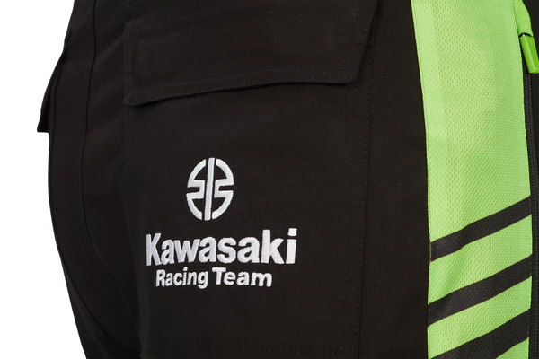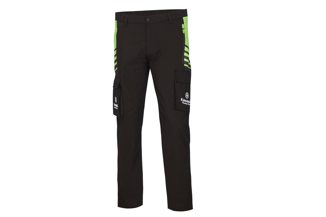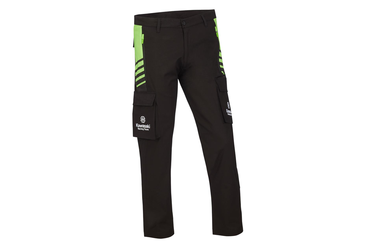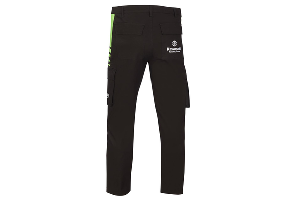 Pantaloni Kawasaki WSBK Cargo Style. Tasche anteriori con zip. Tasche laterali Cargo. Tasche posteriori con flaps. Logo Kawasaki Racing Team. Tessuto di peso medio. 97% cotone 3% elastan.