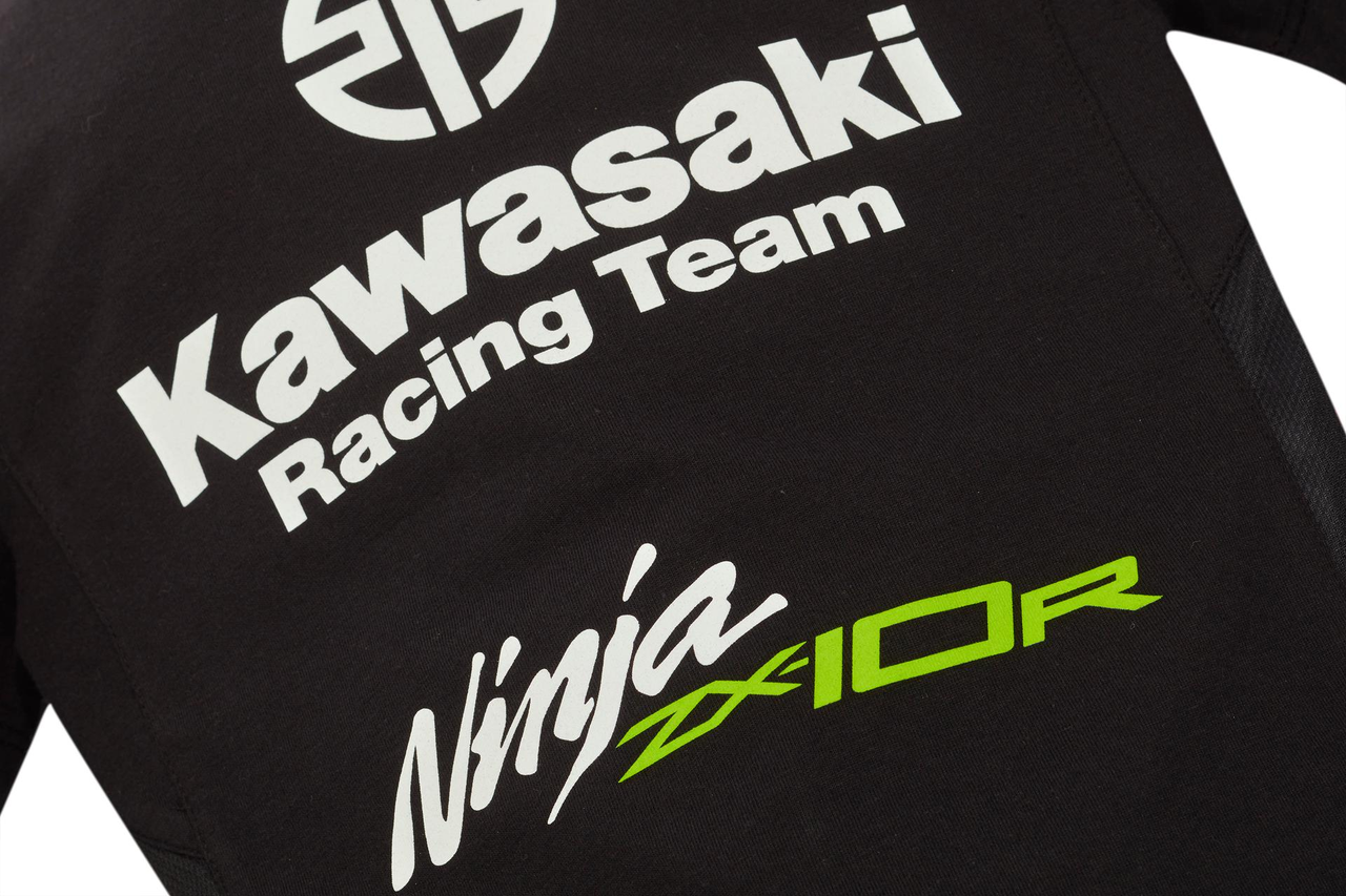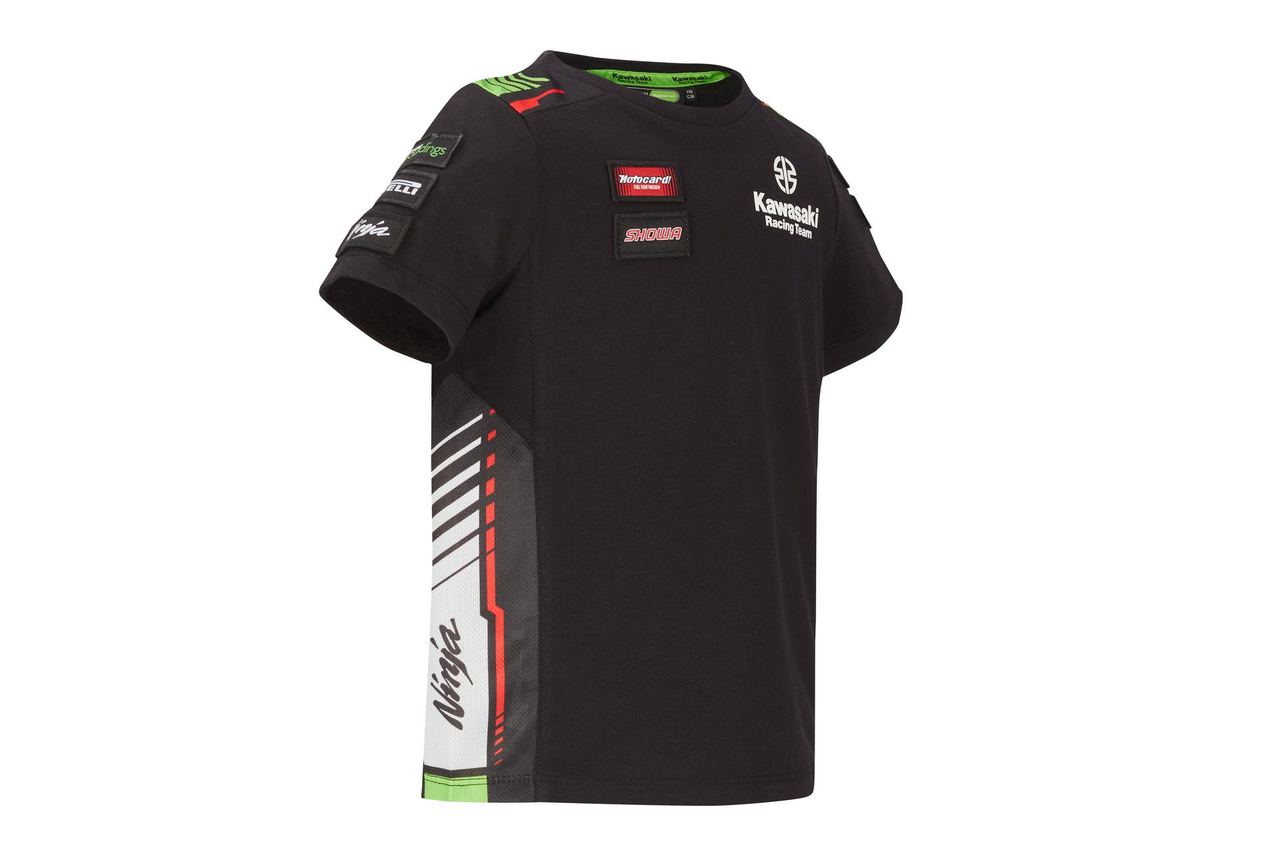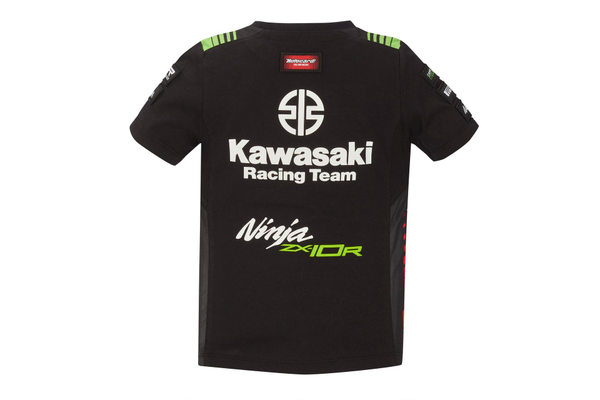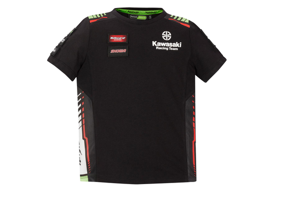 T-shirt Kawasaki WSBK a girocollo. Logo Kawasaki Racing Team e loghi degli sponsor. Tessuto a maglia singola. 50% cotone 50% poliestere.