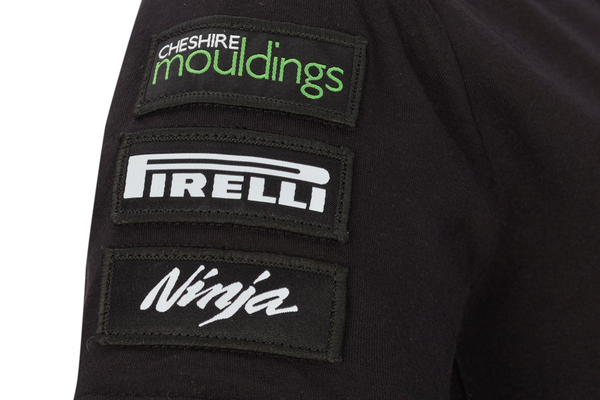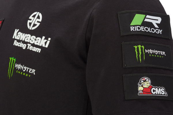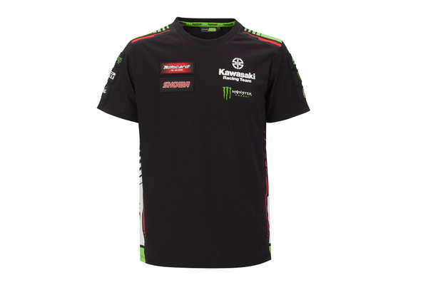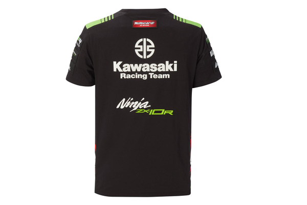 T-shirt Kawasaki WSBK a girocollo. Logo Kawasaki Racing Team e loghi degli sponsor. Tessuto a maglia singola. 50% cotone 50% poliestere.