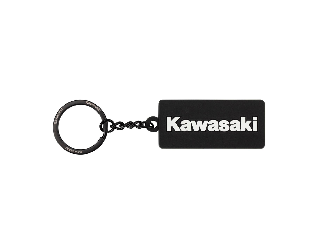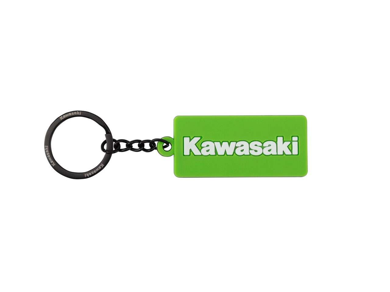 Portachiavi bifacciale nero/verde con logo Kawasaki. Dimensioni: 5,5cm x 2,5cm