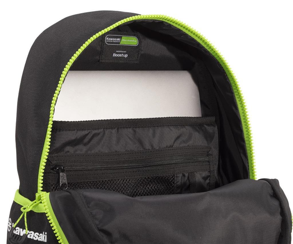 Zaino Kawasaki ispirato alla nuova linea Sports. Tasca interna per laptop. Tasca interna con cerniera per piccoli oggetti. Tasca esterna con zip e logo Kawasaki stampato. Extra tasche aperte su entrambi i lati dello zaino. Zip con logo Kawasaki.