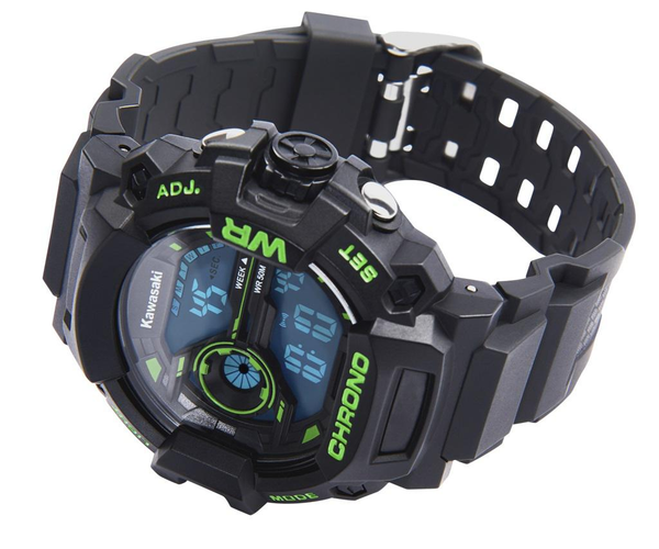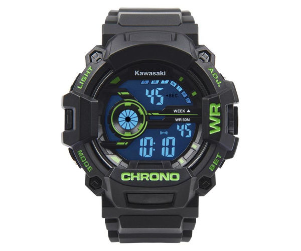 Questo orologio Sport Kawasaki, proprio come le nostre moto, nasce per non perdere colpi. La funzione sveglia ti fa iniziare la giornata con la giusta grinta, mentre il cronografo digitale assicura agli annali i tuoi momenti di gloria. Cinturino in silicone. Funzione calendario.
